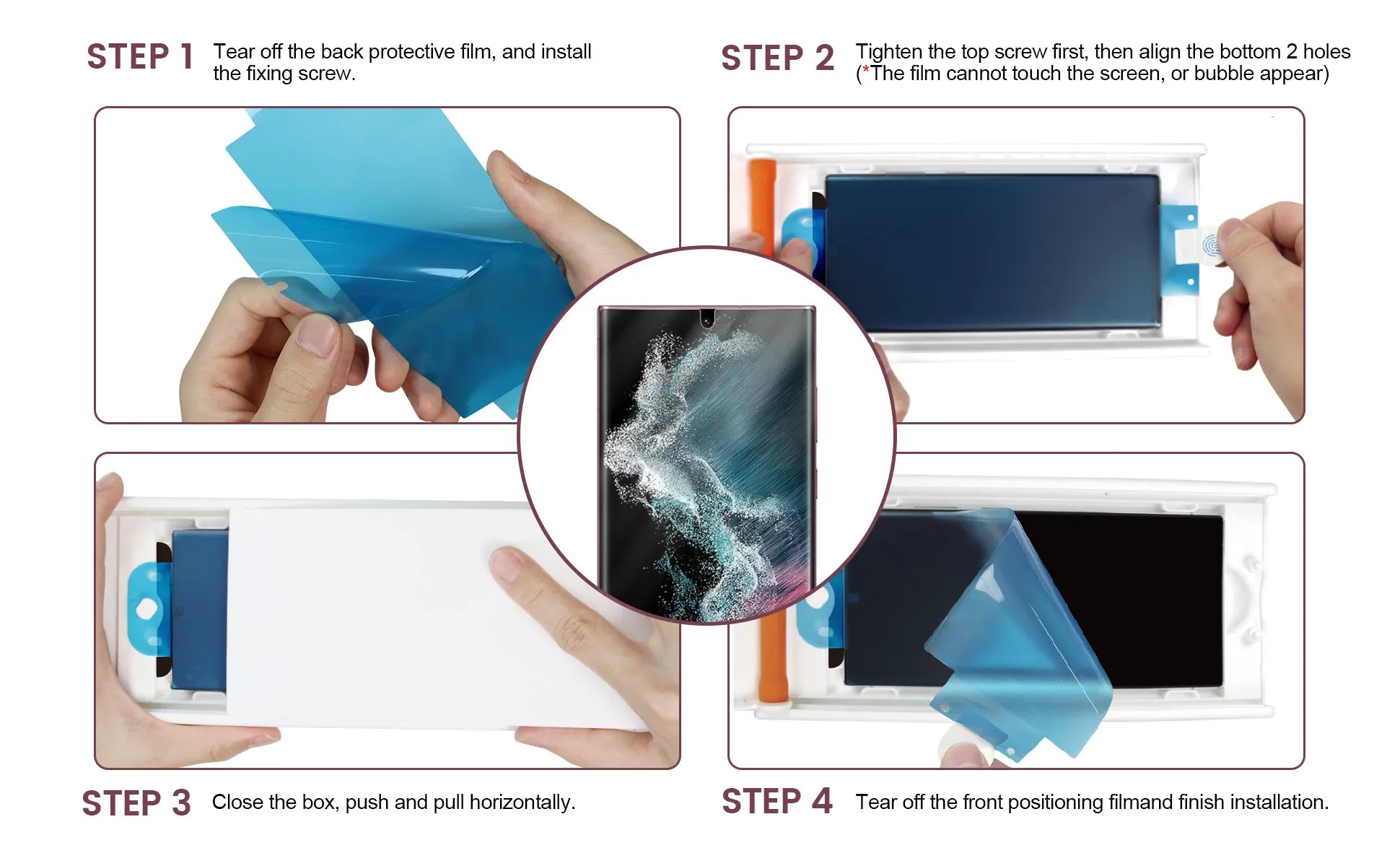 The auto-alignment screen protector box for Samsung Galaxy S22 Ultra allows you to easily install the Galaxy S22 Ultra nanohybrid protective film without generating bubbles and removing residues. It is attached to the phone screen without any gaps or bubbles, so it will not affect touch sensitivity.